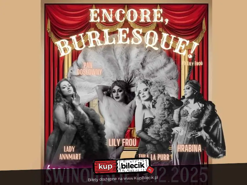Drodzy miłośnicy rozrywki, szykujcie się na prawdziwe święto zmysłów! Wyjątkowe wydarzenie burleskowe, Encore, Burlesque! przeniesie Was w świat pełen elegancji, zmysłowości i niepowtarzalnej magii. Zanurzcie się w wyjątkowym klimacie pełnym blasku, piór, cekinów i tajemnic. Każdy numer to starannie przygotowane widowisko, które na długo pozostanie w Waszej pamięci. Dołącz do nas na wieczór, który obudzi wszystkie zmysły i zostawi Cię z uczuciem rozbawienia, zachwytu i nostalgii. Na scenie wystąpią najznakomitsi artyści burleski i dragu, którzy swoimi występami oczarowują publiczność na całym świecie. Wystąpią: Lily Froú - gwiazda polskiej burleski, międzynarodowa performerka, której serce bije w rytmie lat 20. Jej występy to podróż w czasie do epoki art déco, dymnych klubów jazzowych i niezapomnianych pokazów kabaretowych. Hrabina - pierwsza dama polskiego dragu. Oczaruje was swoim stylem i poczuciem humoru oraz poprowadzi najlepszą konferansjerkę w mieście! Lady AnnMart - założycielka szkoły CaBaReT w Toruniu, performerka burleski, muzyk i choreograf. Uczestniczka telewizyjnych show takich jak: "Must be the music", "Zostań Gwiazdą" i "Mam talent". Tula la Purr - performerka z Warszawy, która która oczaruje was swoją charyzmą i zaprezentuje burleskę w niebanalnym wykonaniu. Pan Dosłowny - jak nikt inny zadba o płynny przebieg przedstawienia oraz komfort widzów i artystów. Encore, Burlesque! to nie tylko występy, ale i możliwość do spotkania z artystami, zrobienia pamiątkowych zdjęć i zatopienia się w wyjątkowej atmosferze. Jest to także idealna okazja na wieczorne wyjście: to doskonały pomysł na randkę, spotkanie z przyjaciółmi lub wyjątkowy wieczór spędzony w gronie bliskich. Bilet VIP - miejsce najbliżej sceny wraz z pierwszeństwem wejścia - 95 zł. Bilet standard - 80 zł. Nie przegapcie tej okazji - liczba miejsc jest ograniczona!