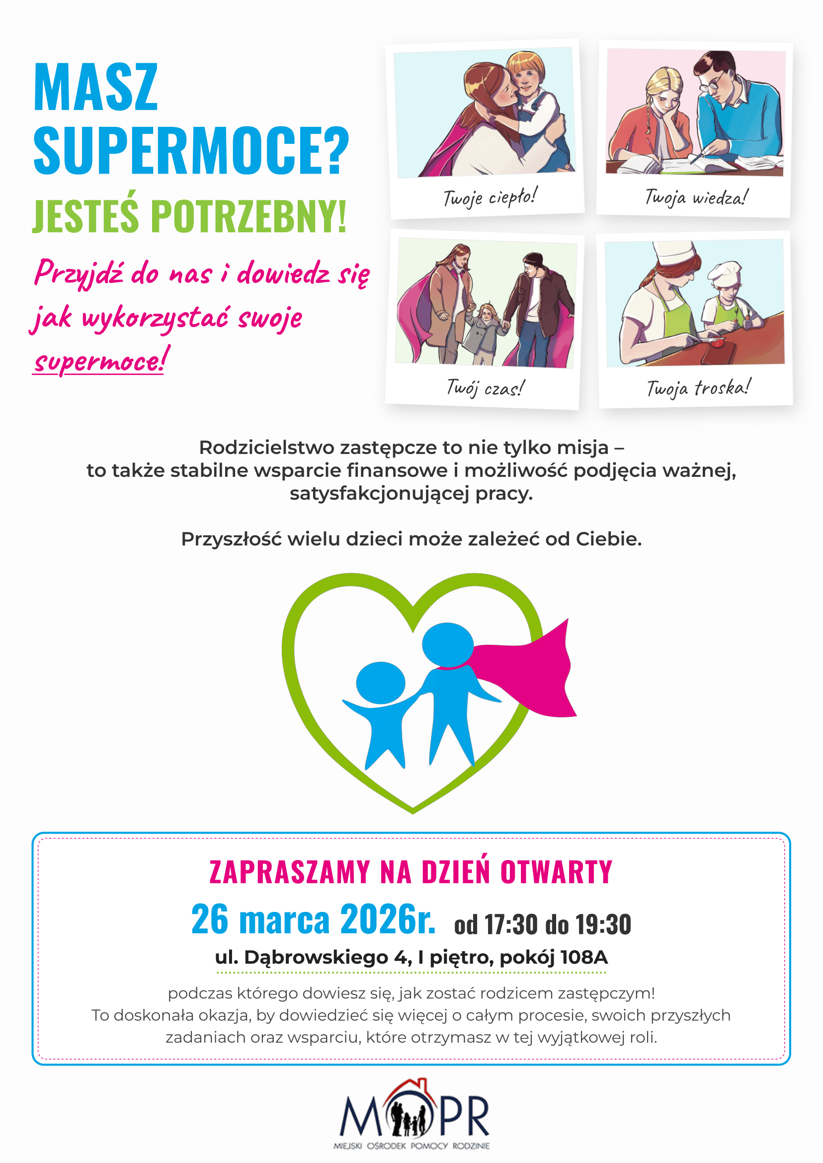 Miejski Ośrodek Pomocy Rodzinie zaprasza na dzień otwarty 26 marca 2026 roku w godzinach 17:30 - 19:30 przy ul. Dąbrowskiego 4, w pokoju 108A na I piętrze.