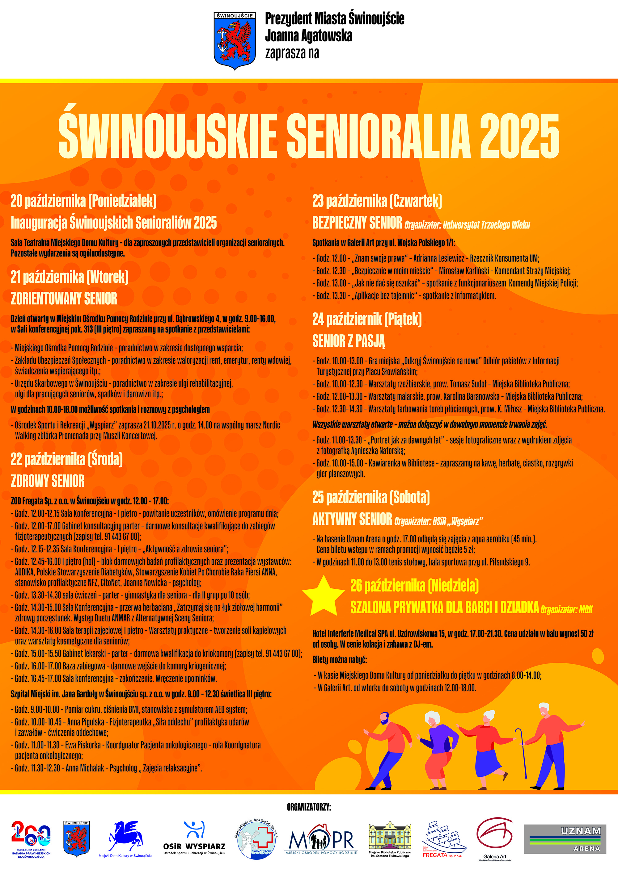 Już w poniedziałek, 20 października, rozpocznie się kolejna edycja Świnoujskich Senioraliów – wyjątkowego tygodnia dedykowanego najstarszym mieszkańcom naszego miasta. Przez siedem dni seniorzy będą mogli uczestniczyć w spotkaniach, warsztatach, badaniach profilaktycznych, zajęciach sportowych i zabawie tanecznej. Organizatorzy przygotowali bogaty program, który ma inspirować, integrować i zachęcać do aktywnego stylu życia.
