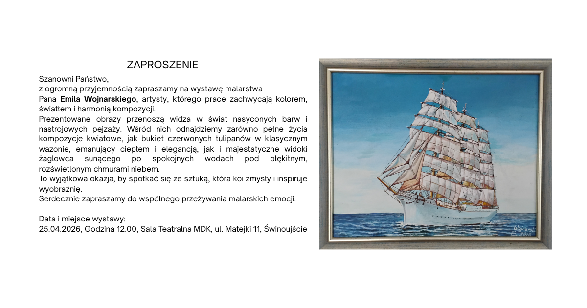 Z ogromną przyjemnością zapraszamy na wystawę malarstwa Pana Emila Wojnarskiego, artysty, którego prace zachwycają kolorem, światłem i harmonią kompozycji.